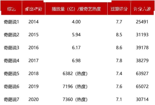 七年之痒的《奇葩说7》迎来了创新与变革。前四季的播放量整体呈不断走高的趋势,从2014年的4亿上涨到2017年的6.98亿。豆瓣评分也稳定在7.7-8.6分之间,评分人数年年攀升。自爱奇艺关闭显示前台播放量,以内容热度代替原有的播放量数据以来,《奇葩说》第5-7季的热度也一直保持在高水平,豆瓣评分呈先上升后下降趋势。相比前两季的超6万人参与打分,最新季仅有近一半的人参与其中。