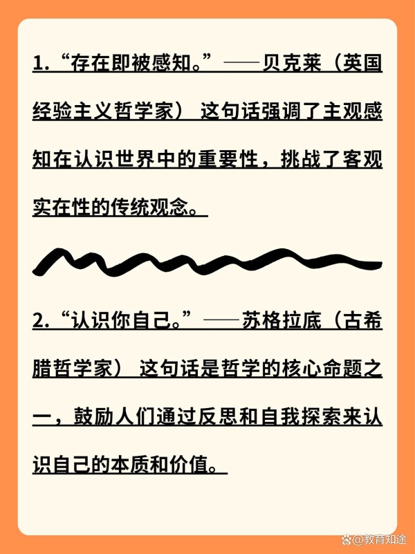 1.“存在即被感知。”——贝克莱(英国经验主义哲学家) 这句话强调了主观感知在认识世界中的重要性,挑战了客观实在性的传统观念。