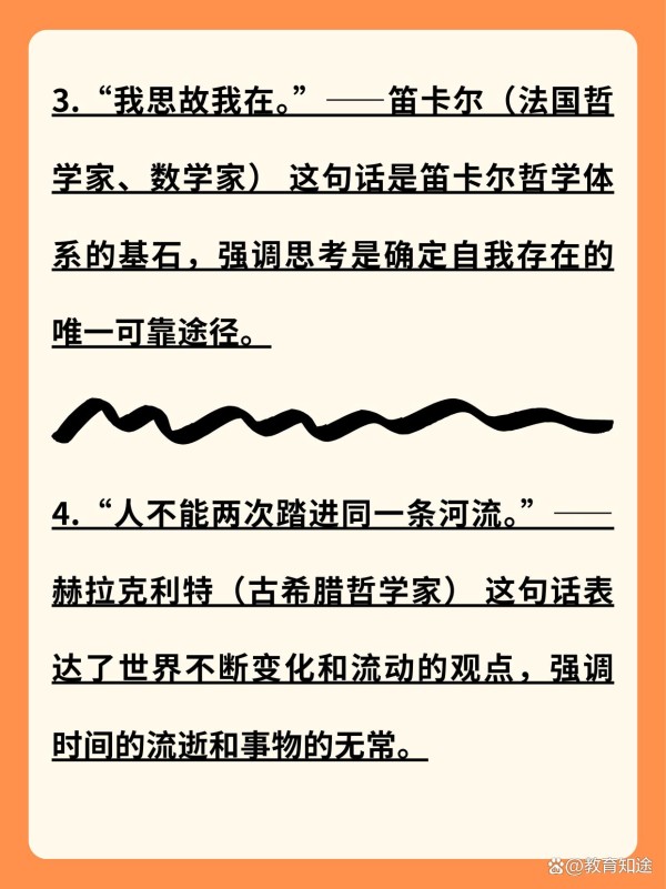 3.“我思故我在。”——笛卡尔(法国哲学家、数学家) 这句话是笛卡尔哲学体系的基石,强调思考是确定自我存在的唯一可靠途径。