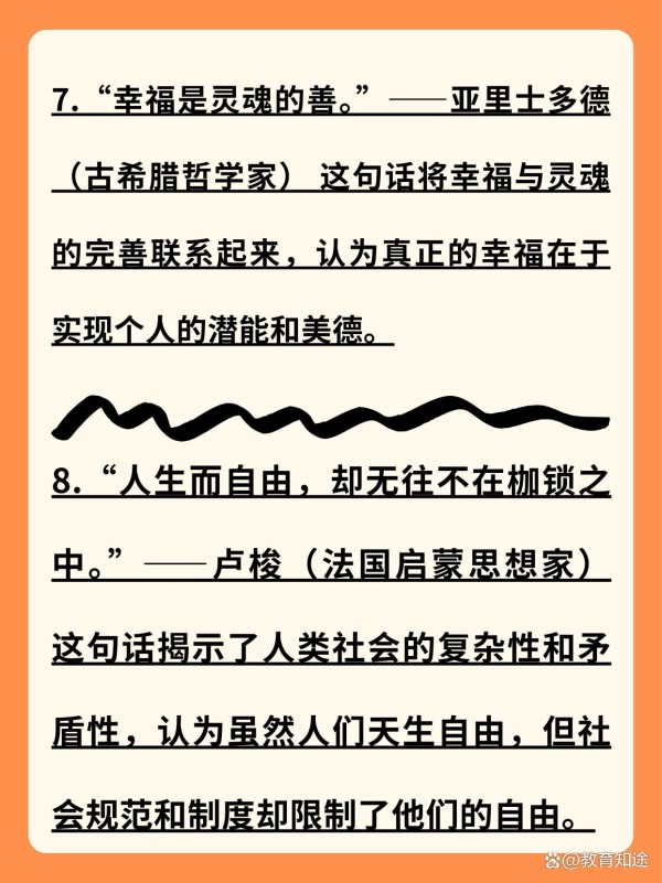 8.“人生而自由,却无往不在枷锁之中。”——卢梭(法国启蒙思想家) 这句话揭示了人类社会的复杂性和矛盾性,认为虽然人们天生自由,但社会规范和制度却限制了他们的自由。