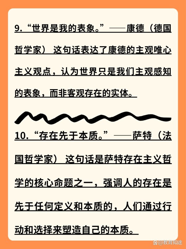 10.“存在先于本质。”——萨特(法国哲学家) 这句话是萨特存在主义哲学的核心命题之一,强调人的存在是先于任何定义和本质的,人们通过行动和选择来塑造自己的本质。