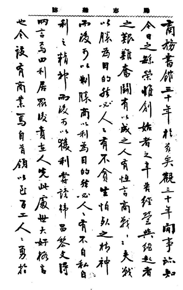 商务书馆三十年於兹矣,观三十年间事, 知今日之繁荣。惟创始者之辛苦经营与 起者之艰难奋斗,有以成之。人有恒言:商战之战,夫战,以胜为目的,然必人人有不贪生怕死之精神,而后可以制胜;商以利为目的,然必人人有不自私自利之精神,而后可以获利。尝读韩昌黎文,得两言 曰:“利居众后,责在人先。”此处世大好极言也。今后有商业焉,自首领以至百工人,勇於负责,淡於取利,其上倡之,其下化之,公家不忍薄待其人,以自封殖,而人人亦不忍剥公家以自肥,相爱相谅以为心,群策群力以为用,此商务书馆过去三十年之所以繁荣也。苟循是不改,且益进焉,则虽永久繁荣自三十年以至三百年、三千年,亦何不可?仆惟雅重此文化寔业机 ,稔知其辛苦艰难历史,爱之 ,期之切,故不愿为寻常祝贺之词,而已规为颂焉。