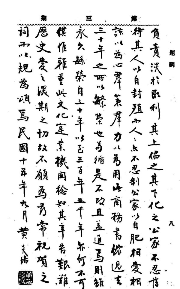 古人以三十年为一世,《论语》“必世而后仁”,言久道化成,未易旦夕睹也。吾乡俗谚有“三十年河东,三十年河西”之语,言人世沧桑兴替之靡定也。余今五十七岁矣,二十岁步博士弟子员,性嗜购书,喜游书肆,以印书馆发皇文化,嘉惠士林,足迹所经,每与分馆时相接洽,本年八月为三十周年纪念,应为文以祝。余慨夫此三十年以前,由光、宣以迄民国,陵迁谷易,波谲云诡,变态不堪回首,而印书馆循序渐进,持之以恒,遂致日新月异而岁不同,蔚然为我国商务巨业,全球知名。吾尝谓天下自乱,我心自治,若印书馆其庶几乎?其庶几乎,由前以观,可知将来。吾知当事者体天行之健,以自强不息,再几阅三十年,亦必以一日之精诚贯之,其纪念岂不极耶。