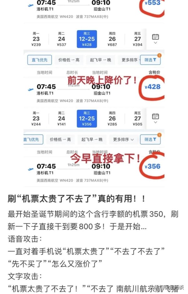 网友发现,在购票平台反复吐槽“机票太贵了,不去了”,算法会误以为你是“价格敏感型用户”,反而推送低价票。于是全网掀起“哭穷式购票”:“打工人不配飞,还是坐绿皮吧”成了“砍价咒语”。