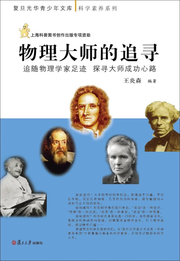 本书是王炎森教授结合自己丰富的培养人才的经验,在阅读了大量资料的基础上,针对中学生的特点,精心选材写作而成。全书不同于一般的传记类图书,突出介绍了中学生非常熟悉、钦佩、敬重的5位世界级物理学大师:伽利略、牛顿、法拉第、居里夫人和爱因斯坦的成长和成才的心路历程。书中尽量采用大师们本人生动、朴实的语言来展现他们的心灵感悟,揭示他们成功的奥秘。他们不仅为物理学发展做出了具有里程碑意义的贡献,而且为后人留下了宝贵的精神财富,他们是年轻人在“立人”之路上值得学习的榜样,“要成为最优秀的人,就要向最优秀的人学习”。本书不仅具有思想性和科学性,而且具有可读性和启迪性,是一本适合青年人阅读的励志读物。