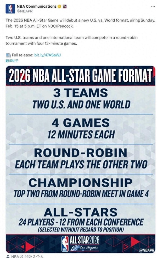 新赛制下,全明星首发不再按位置划分,而是综合人气与表现选拔。最终24人名单仍由东西部各12人组成,但分组依据国籍:美国球员组成两支“美国队”,国际球员则集结为“世界队”。这意味着,像文班亚马(法国)、约基奇(塞尔维亚)、东契奇(斯洛文尼亚)这样的国际巨星将集中亮相,形成极具观赏性的“全球梦之队”。