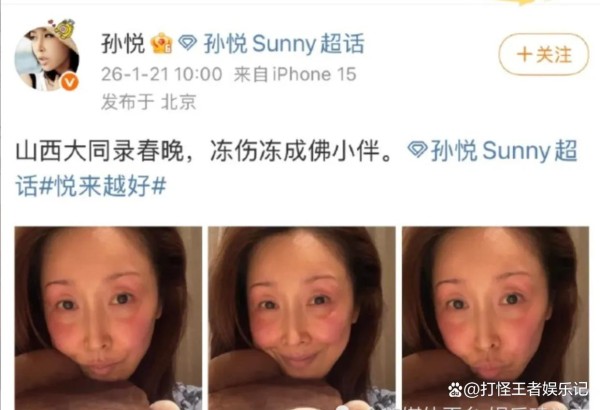 你们看到孙悦昨天发的那张照片了吗? 我点开的时候都倒吸一口凉气。 脸通红,眼圈那块粉粉的,她自己还开玩笑说“冻成佛小伴了”。 这可不是化妆,是实打实在山西大同录春晚给冻伤的。 听说那边零下二十多度,体感温度能到零下二十五。 一个五十多岁、早就功成名就的天后级歌手,为了录个节目,脸冻成这样,图啥呢?