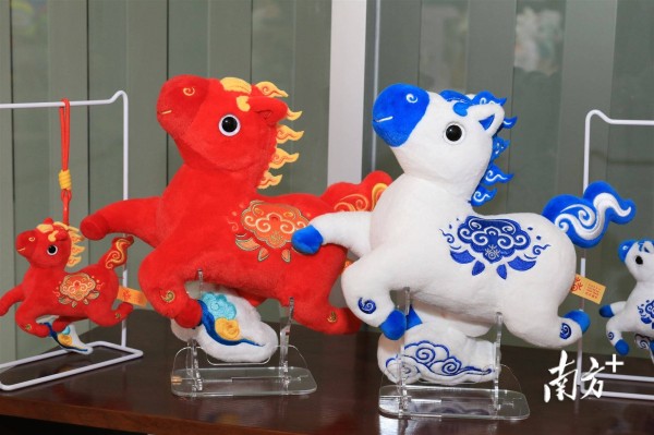 该吉祥物以东汉铜奔马“马踏飞燕”为设计灵感,借鉴唐代五花马的鬃毛装饰手法,中国红主色搭配祥云、如意纹样,辅以青花配色款,尽显新春喜庆氛围。