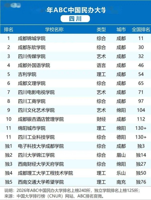 2026年ABC中国民办大学排名正式发布,四川地区民办高等教育格局呈现新气象。成都锦城学院蝉联榜首,彰显综合实力。四川传媒学院、成都外国语学院分列艺术、语言类翘楚。吉利学院、成都文理学院、四川电影电视学院等紧随其后,展现多元发展路径。四川工商学院、四川文化艺术学院、成都银杏酒店管理学院等同样实力不俗。独立学院方面,电子科技大学成都学院、四川大学锦江学院等凭借母体优势跻身前列。此次排名反映出四川民办高校整体水平持续提升,特色化办学路径日益清晰。