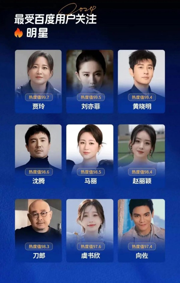 #2024百度热搜年度报告#百度公布2024最受用户关注明星榜单,黄晓明、贾玲、刘亦菲、向佐等人榜上有名