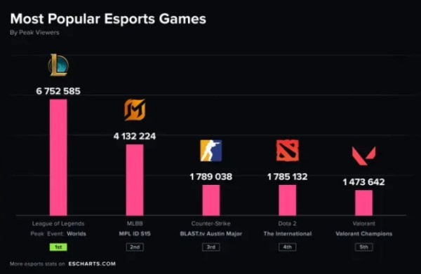 2025年游戏热度排名,LOL断崖式领先,dota2只排名第四,近日,外媒EsportsCharts公布了2025年各大电竞项目的赛事观看峰值数据,这份榜单再次直观地展现了全球电竞格局的真实差距。