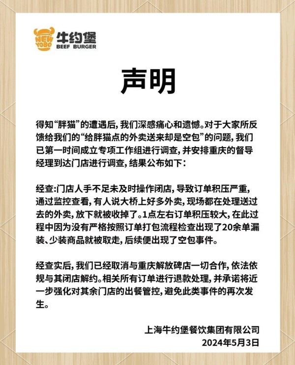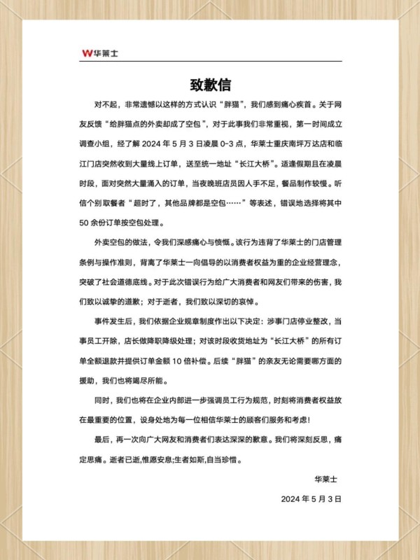 华莱士在致歉信中表示:“我们深感痛心,‘胖猫’事件以这种方式被公众所知。我们对此深表歉意。” 同时,他们也表示对于逝者深感哀悼。为纠正此次错误,华莱士已依据企业规章制度作出以下决定:涉事门店将停业整改,当事员工将被开除,店长也将受到降职降级处理。此外,该时段内收货地址为“长江大桥”的所有订单将全额退款并提供订单金额10倍的补偿。