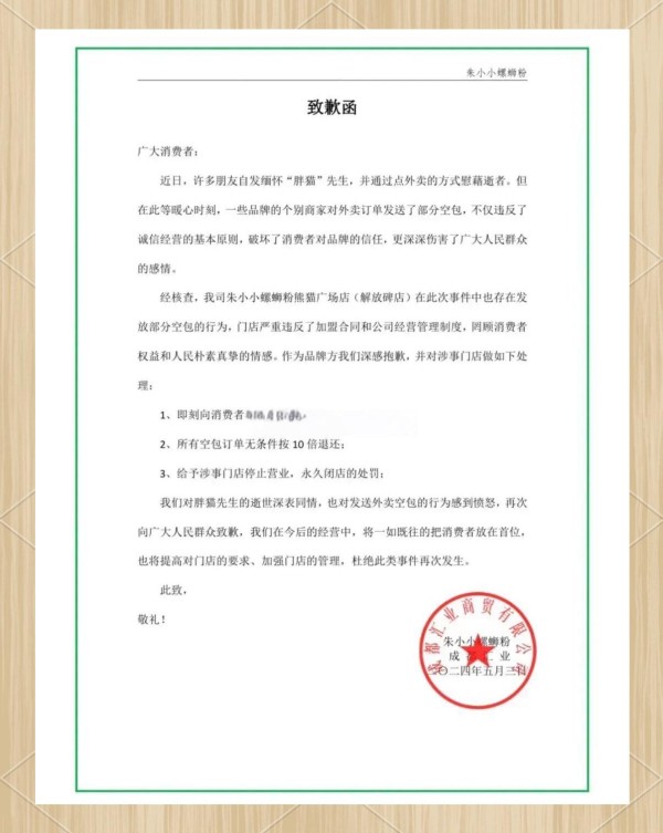 连锁螺蛳粉品牌朱小小螺蛳粉也发布了致歉函。经核查,该品牌熊猫广场店(解放碑店)在此次事件中存在发放空包的行为,严重违反了加盟合同和公司经营管理制度,损害了消费者权益和人民朴素真挚的情感。为此,他们深表歉意,并已第一时间对该门店做出了永久闭店处理。同时,承诺将10倍退还所有空包订单。