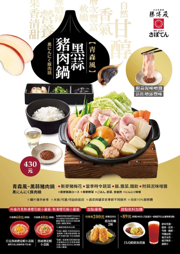 以小火慢熬的黑蒜高湯為基底,蒜香濃郁卻清爽回甘,湯頭層次深厚,搭配油花均勻、口感柔嫩的斯麥豬梅花肉片,一口湯、一口肉,再佐上蒜泥味噌醬,更添風味。簡單卻滿載暖意,是寒冬最療癒的補冬鍋物,適合與家人好友在節日相聚時一同品嚐。