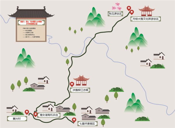 丹棱大雅文化旅游景区——桃花源景区——洪雅柳江古镇——雅女湖有机农庄——复兴村——七里坪度假区