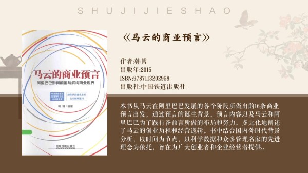 《马云的商业预言》有相关描述, 马云在初创阿里巴巴时,便以其独到的商业预言为企业定下了基调。他坚信亚洲电子商务应有别于美国模式,走出一条属于自己的路。这一理念不仅体现在他对中小企业市场的精准定位上,更彰显在他对未来电子商务发展的宏大愿景中。马云领导阿里巴巴,通过不断创新和调整战略,逐步实现了这些预言,将阿里巴巴打造成为全球领先的电子商务巨头。