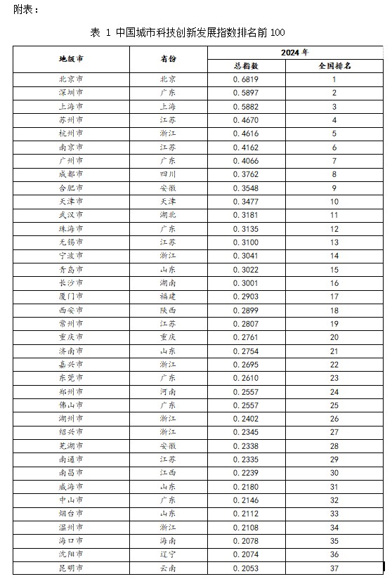 《中国城市科技创新发展报告(2025)》显示,2024年度中国城市科技创新发展指数排名前20位的城市依次是:北京市、深圳市、上海市、苏州市、杭州市、南京市、广州市、成都市、合肥市、天津市、武汉市、珠海市、无锡市、宁波市、青岛市、长沙市、厦门市、西安市、常州市、重庆市。