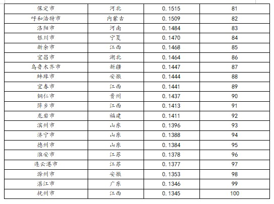 从省区层面来看,排名前20的城市中,除北京市、上海市、天津市、重庆市4个直辖市外,江苏省的城市最多,有4个城市,依次为:苏州市、南京市、无锡市、常州市。其次是广东省,有3个城市进入排名前20,分别为:深圳市、广州市、珠海市。