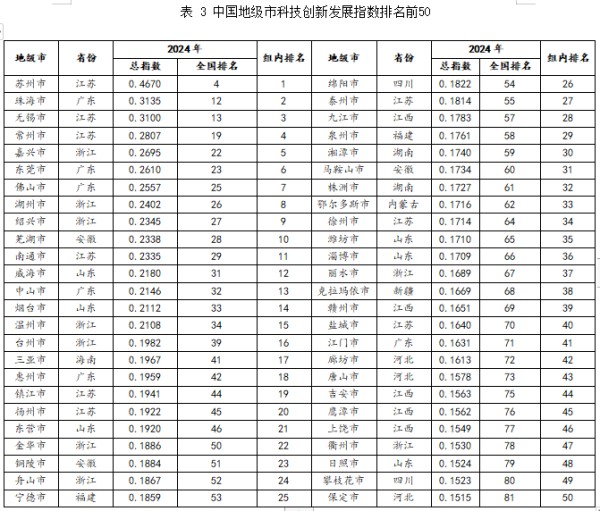 地级市科技创新发展指数排名前10位的城市依次是:苏州市、珠海市、无锡市、常州市、嘉兴市、东莞市、佛山市、湖州市、绍兴市、芜湖市。其中,长三角、珠三角城市群的地级市在排名中表现突出。从排名前50位城市的分布来看,江苏省、浙江省、广东省、山东省、江西省5省城市占据了72%。
