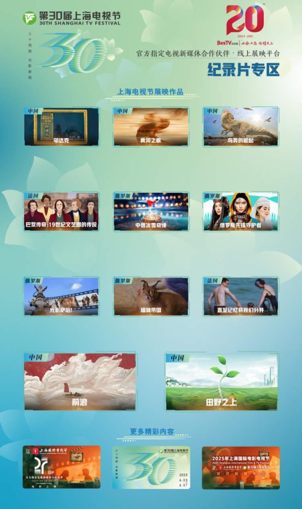 第30届上海电视节线上展映专区将于6月23日上线,既有互联网独家展映的伊朗剧集《德黑兰蝰蛇》、入围“白玉兰奖”最佳系列纪录片的《鸟类的崛起》等10多部海内外佳作,又有集中呈现本届“白玉兰奖”最佳中国电视剧入围作品的精彩片花。在官方展映片目中,《邬达克》一片讲述了这位建筑大师在上海的经历,展现文明互鉴造就的传奇;《中俄冰雪奇缘》讲述了一群中国小女孩在俄罗斯受训,追寻花滑梦的故事;法国纪录片《巴黎传奇:19世纪文艺圈的传说》则展现了维克多·雨果、大仲马、巴尔扎克等著名作家创造的辉煌时代……佳片云集,让观众朋友们一饱眼福。
