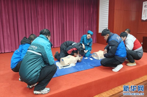 1月20日,快递员在鹤壁市人民医院医护人员的指导下练习人工呼吸步骤。王家胜 摄