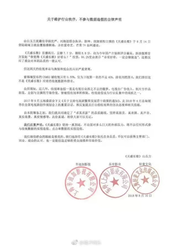 据了解,由陈坤、倪妮主演的电视剧《天盛长歌》,播出时收视率低迷。2018年8月16日,《天盛长歌》的出品方发布声明表示,电视剧的收视率与舆情和观众的共识严重背离,近几年,收视率造假一直是电视行业挥之不去的噩梦。《天盛长歌》坚持一真到底,不论面对多么巨大的外部压力,将不以任何形式参与收视数据的买假造假、点击率数据的买假造假。