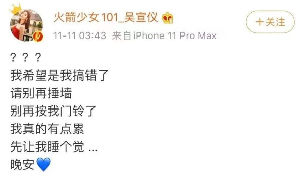 受到私生打扰的明星孟美岐不是唯一,同公司的吴宣仪某次也在主页喊话,曾经有粉丝在酒店房间隔壁捶墙敲门按门铃,让吴宣仪没办法睡觉,甚至有次还拿走了她的行李箱。