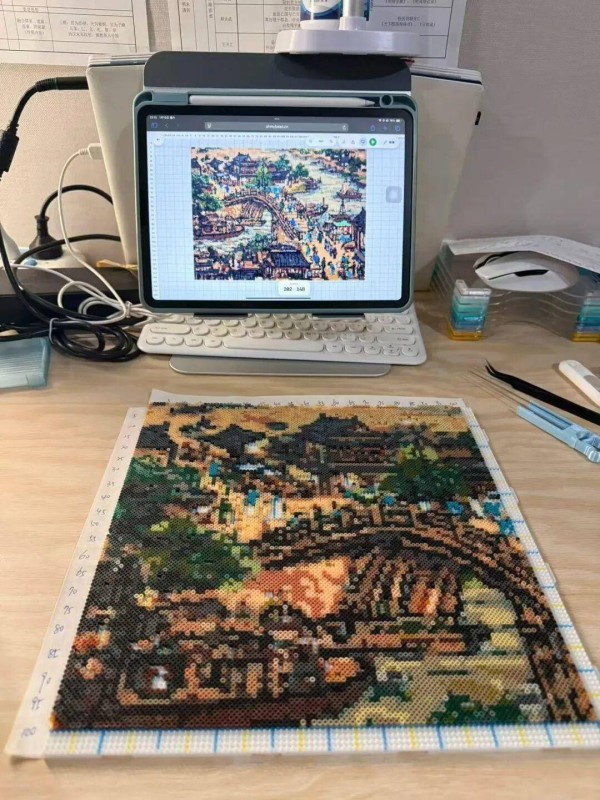 张梦表示,自己非常喜欢名画画作,早在2022年就拼过梵高《星月夜》和莫奈《睡莲》等写意名画,“我看到过拼豆版的《富春山居图》,但是鲜有人拼《清明上河图》,我就想,那我来试试吧。”