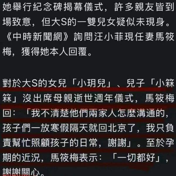 纪念碑的揭幕仪式,有许多亲友到场致意。但大S的一双儿女并没有现身,针对这个问题汪小菲妻子马筱梅给予回应。