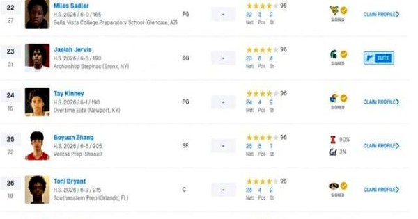选秀平台Rivals26届全美高中生榜单:张博源升到第25 郇斯楠第57
