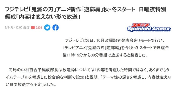 另外,这次消息特别提到富士电视台表态“忠于原作内容的形式播放”,为什么要特别声明?日本网友都知道富士电视台获得首播权的动画“声誉”都不好,在电视台首播的《约定的梦幻岛》第二季等作品都有大量魔改,给观众留下不好印象,因为该电视台会介入动画制作方向,避免血腥等不适内容出现在动画里,所以当他们得知第二季在该电视台首播时,就非常担心动画因富士电视台介入而魔改,尤其是该篇章涉及“花街”且那么多小孩爱看。