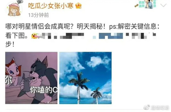 巧合的是,一位八卦媒体预告爆料恋情,称:哪对明星情侣会成真?明天揭秘,还晒出了一幅漫画,让网友猜测。