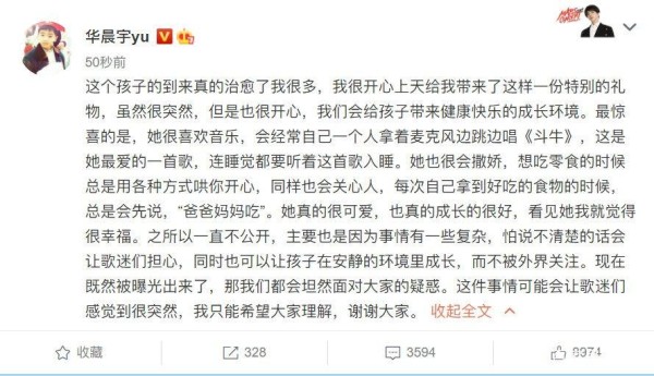 前些天,一直有爆料称有一位3000万粉丝的男顶流生孩子了,女方还是圈内人,传闻传到华晨宇和张碧晨身上。本以为是谣言,结果1月22日,华晨宇和张碧晨发文承认了孩子的存在。