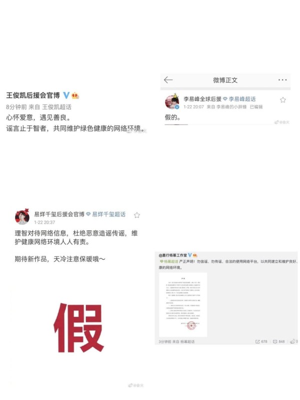 杨幂、李易峰、王俊凯、易烊千玺工作室都相继发布声明辟谣网上的传闻,拒绝恶意造谣传谣。