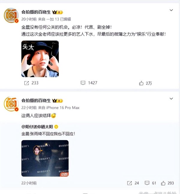更夸张的是,他已经不满足于只锤金晨一个人了,甚至把战火烧到了白敬亭、王安宇等其他明星身上,一副要凭一己之力“整顿娱乐圈”的架势。