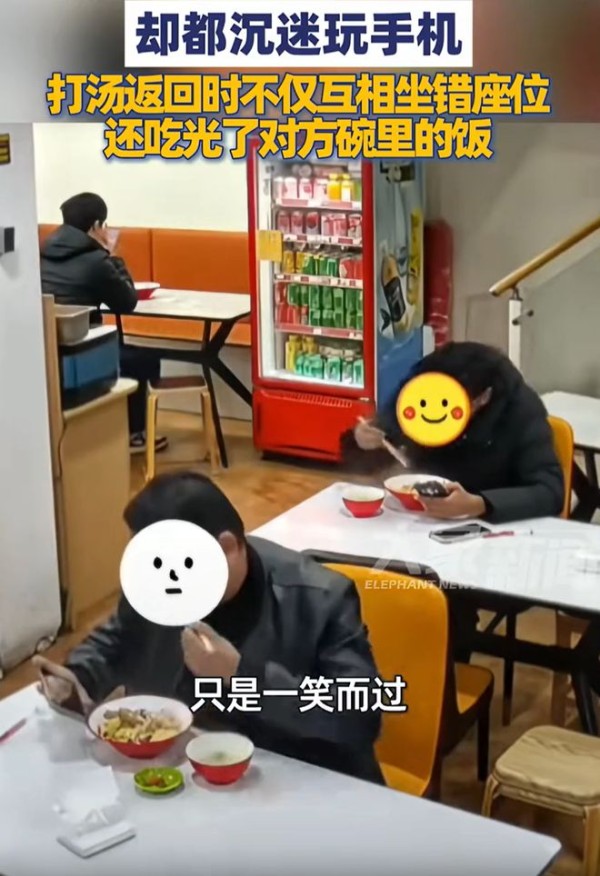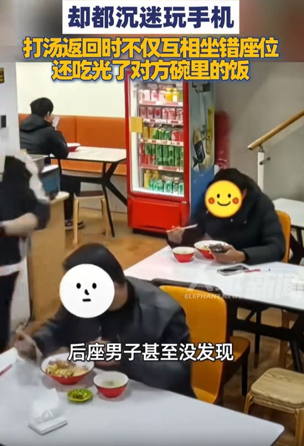 两名陌生男子吃饭时沉默玩手机,打汤返回时吃错饭都没发现