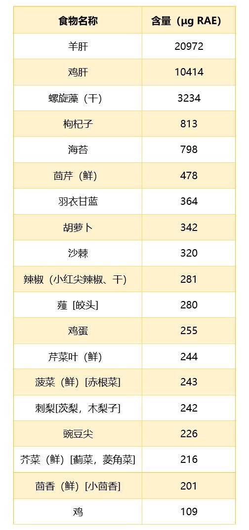表2 富含维生素A的常见食物排行榜