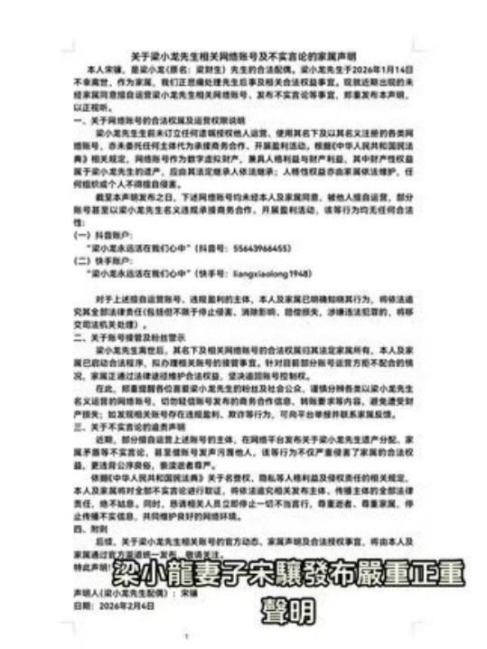 未经家属的同意擅自运营,梁小龙的遗孀宋驤直指,梁小龙生前未有任何的遗嘱,授权他人经营账号。