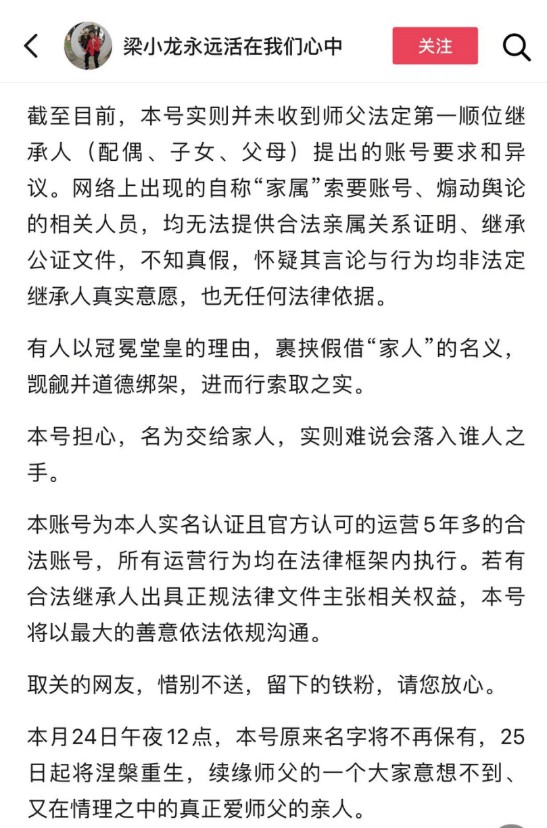 接着该账号运营者称,他并未收到师父梁小龙法定第一顺位继承人,提出的账号要求和异议。
