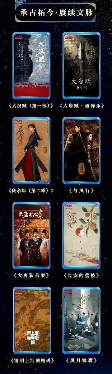 第二个版块是“承古拓今·赓续文脉”片单合集,包括了《大汉赋(第一部)》、《大唐赋·破阵乐》、《