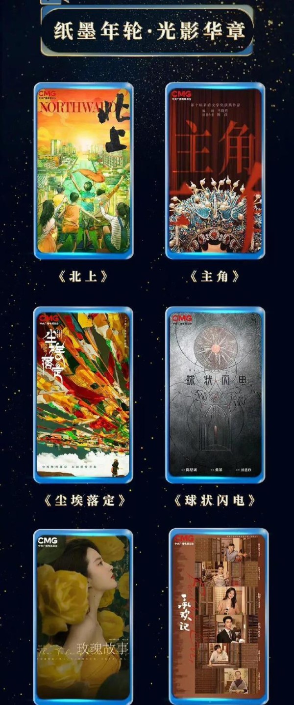 第三个版块是“纸墨年轮·光影华章”片单合集,其中的剧集有《北上》、《主角》、《尘埃落定》、《球