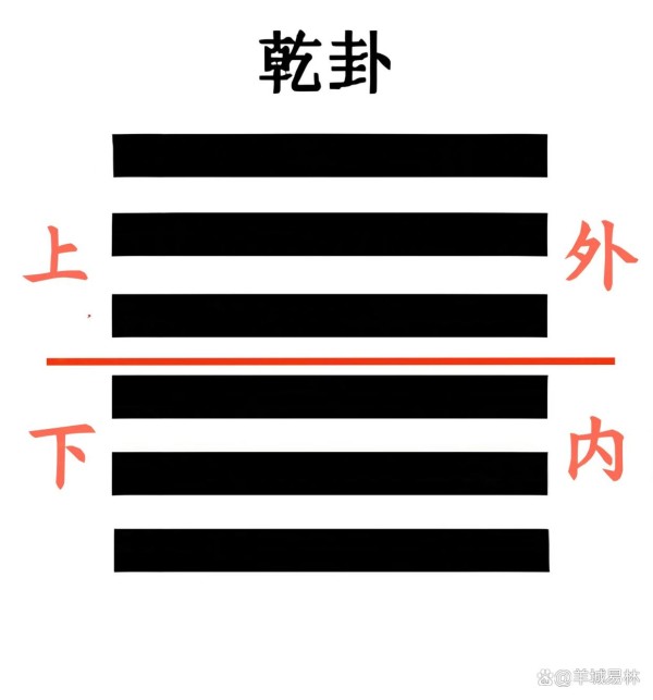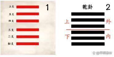 如上图2,以乾卦为例,乾卦的六个爻,是由上、下或内、外两个乾的经卦所组成。这样划分,是因为在实际应用时,碰到特殊情况可能会用到。