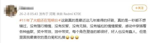 网友调侃这是“史上最长情售后”,大姐对明台的“碎碎念”从民国延续到现代,战斗力比WiFi信号还持久,还有网友戏称新剧可改名为《大姐的11年碎碎念》,观众从“追剧”升级成“追更骂”。