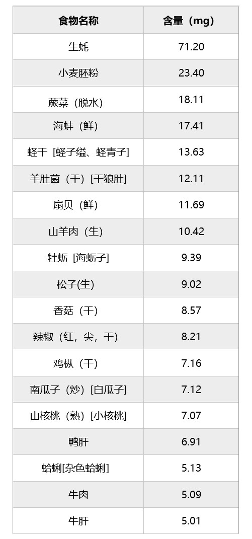 表9 富含锌的常见食物排行榜(以/100g可食部计)