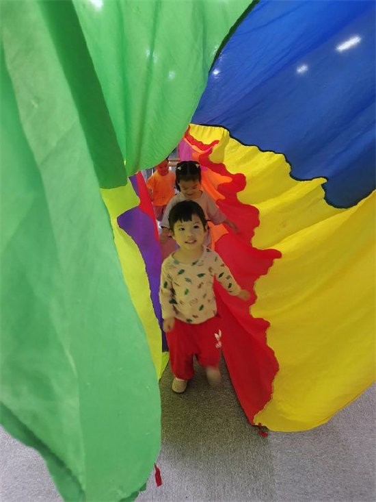 活动在音乐游戏中拉开帷幕,宝宝和家长们在教师的带领下伴随着欢快的音乐一同围坐在一起进行音乐律动、自我介绍。宝宝们在轻松、愉快的气氛中放松了紧张的情绪,开心地融入到集体游戏中。精细动作《漂亮的项链》在锻炼宝宝的手指肌肉力量的同时提高手眼协调能力。随后,宝宝们在 “彩虹滑滑梯”“蒙古包”和“拍泡泡”等彩虹伞游戏,让孩子在欢快的游戏过程中对运动产生兴趣,在游戏中锻炼孩子的视觉空间感和反应能力。接着,艺术活动《五彩音乐瓶》,不仅可以让宝宝练习技能“塞”,更能引导宝宝感知音乐的节奏。最后,早教老师还对家长进行了现场指导,帮助家长在家中开展科学有趣的亲子活动,为家长解答育儿困惑,树立科学的育儿理念。