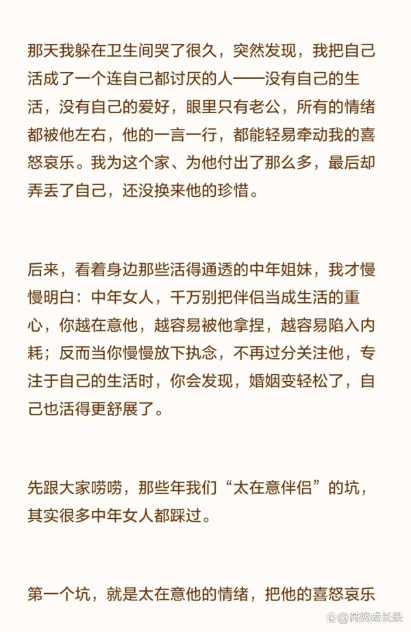 愿每一个中年女人,都能读懂这份通透,在婚姻里不卑微、不委屈、不内耗,活得自在、洒脱、光芒万丈。