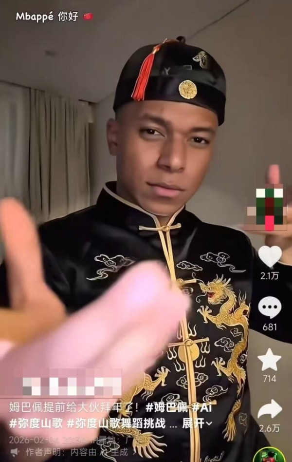 以上并不是真实发生的场景,在视频下方,一行小字标注:“作品含AI生成内容”,这是近期在短视频平台颇为流行的AI名人拜年模板,从外国球星身穿中国服饰跳起民族舞蹈,到逝去多年的明星重现银幕送祝福。春节临近,类似的合成短视频在各大社交平台出现,AI技术也正在以一种前所未有的娱乐化姿态介入我们的传统节日。