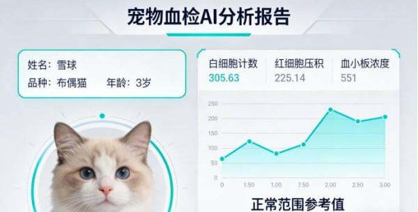 在血检识别分析方面,系统可对血常规报告中的红细胞、白细胞、血小板及分类计数进行自动解析,并结合宠物品种、年龄及历史健康档案建立动态健康基线。例如,当宠物白细胞计数异常升高时,系统不仅提示炎症风险,还会结合淋巴细胞与中性粒细胞比例变化,辅助判断是否可能存在细菌感染或免疫系统异常。研究数据显示,在AI辅助判读下,血常规异常识别准确率可提升约20%以上。