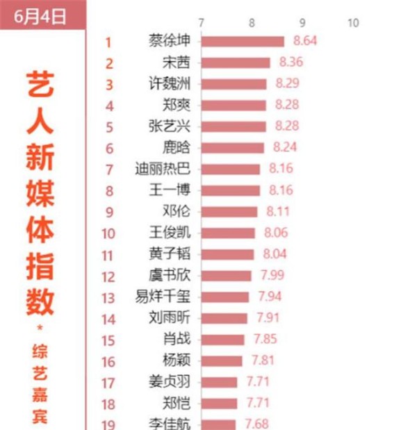 不得不说蔡徐坤排在榜首真的有点意外了,毕竟关于他的消息变得很少,不过蔡徐坤还是会在综艺中露脸,尤其是《快乐大本营》,还是《奔跑吧》第四季的常驻嘉宾,难怪这么有热度!你们最喜欢谁呢?