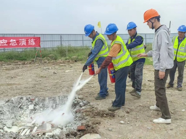 风电公司演练模拟场景为风电升压站项目主设备材料堆放区域发生火灾,现场人员发现火情时,火势已开始蔓延,烟雾较大。现场负责人迅速拨打“119”报警,同时报告应急指挥组,立即启动消防应急预案。疏散引导组组织正在附近施工的人员快速逃生撤离,同时灭火行动组立即赶到着火现场,用灭火器进行初期火灾扑救。